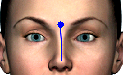 Reibe zuerst den Reflexpunkt zwischen den Augenbrauen. Streiche dann von dem Punkt aus, 3-4 Mal, über den Nasenrücken bis zur Nasenspitze.